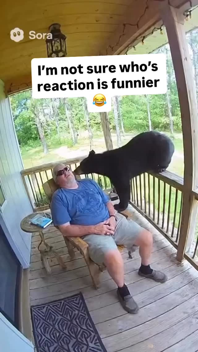 A man relaxing on his porch in what seems like a quiet countryside was completely unaware that a curious visitor had decided to stop by — a black bear! 🐻